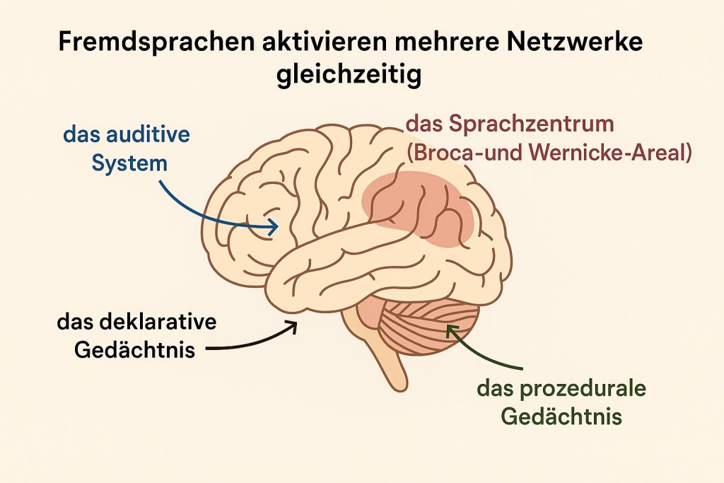 Fremdsprachenlernen aktiviert mehrere Netzwerke gleichzeitig. Dazu gehören das auditive System, das Sprachzentrum (Broca- und Wernicke-Areal), das deklarative Gedächtnis (bewusstes Wissen wie Vokabeln) und das prozedurale Gedächtnis (automatisierte Abläufe wie Grammatikstrukturen).